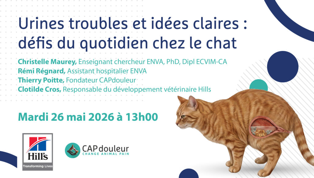 Urines troubles et idées claires : défis du quotidien chez le chat En partenariat avec : Urines troubles et idées claires : défis du quotidien chez le chat Mardi 26 mai 2026 De 13h à 13h45 Présenté par Christelle Maurey, Enseignant chercheur ENVA, PhD, Dipl ECVIM-CARémi Régnard, Assistant hospitalier ENVAThierry Poitte, Fondateur CAPdouleurClotilde Cros, Responsable […]